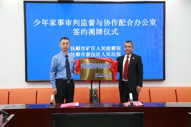 为深入学习贯彻党的二十大精神,认真贯彻落实《中共中央关于加强新时代检察机关法律监督工作的意见》,扎实开展涉未案件法律监督工作,促进未成年人检察业务更加专业化、规范化。5月10日,矿区检察院与新抚区法院举行全省首家少年家事审判监督与协作配合办公室揭牌仪式,并会签《关于对涉未成年人案件审判活动实行法律监督的协作机制》。